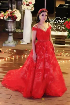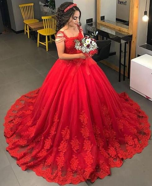 2019 Vintage Red Ball Gown Wedding Dresses Lace Cap Sleeves Off Shoulder Sweep Train Tulle Bridal Wedding Gowns Elegant Vestido De Novia Bride Dresses