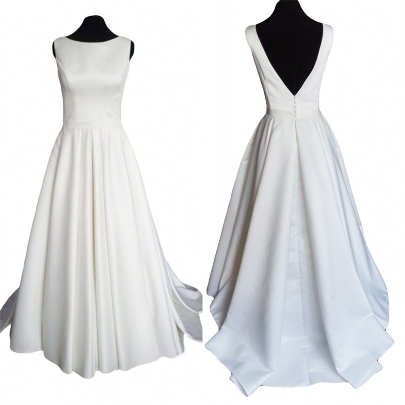 Discount Modern Simple Satin Wedding Dress 2019 With Open Back Court Train Ruffled Scoop Neck High Quality Custom Made White Bridal Gowns Cheap China