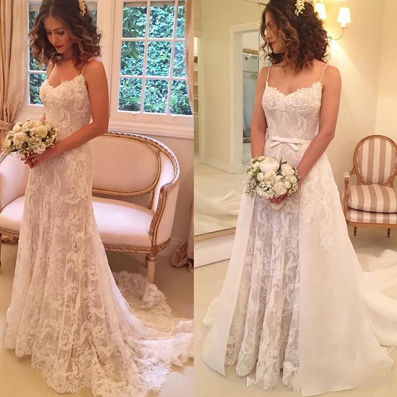 Discount 2019 A Line Simple Spaghetti Lace Wedding Dresses Detachable Tail Ruffle Button Backless Sweep Train Bridal Gown Beach Wedding Dress Perfect
