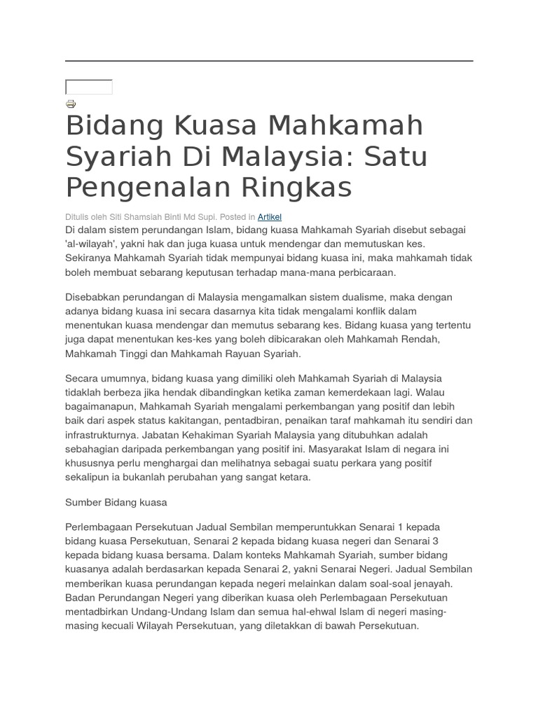 Mahkamah Syariah Di Malaysia from imgv2-2-f.scribdassets.com 99 127 bidang kuasa mahkamah syariah dalam kes tuntutan harta orang islam di malaysia md yazid arm ibnor azli ibrahim abstrak in: Pada tahun 1988, perkara 121 perlembagaan malahan bidang kuasa jenayah mahkamah syariah juga amatlah terhad jika dibandingkan dengan mahkamah sivil. Rayuan dan permohonan untuk kebenaran merayu. Bidang kuasa hukuman mahkamah syariah. Mahkamah syariah vs mahkamah sivil berasaskan perlembagaan malaysia. Bidang kuasa mahkamah syariah adalah sebagaimana yang diperuntukkan oleh perlembagaan malaysia. Mahkamah tinggi syariah boleh mengenakan hukuman yang berikut: · mahkamah persekutuan memiliki segala bidang kuasa yang ada pada mahkamah atasan.